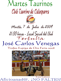 El próximo Martes, 7 de Julio «San Fermín», a las 21 horas el Club Taurino de Calasparra, celebrará las tertulias taurinas «primer martes de cada mes» en el local social del Club, (cl. sovocos, 5 bajo).Este mes nuestro invitado será el novillero José Carlos Venegas, Triunfador de la Feria 2008 y ganador del Trofeo Espiga de Oro.