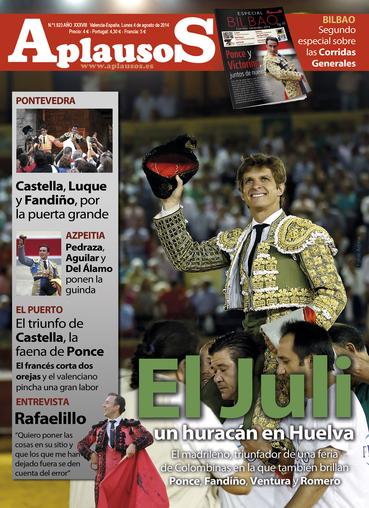 «La feria está consolidada. ¿Secreto?, aquí no hay seÂcretos. Solo hay una receta, trabajo, comunicación y el conocer bien cada plaza”. Son palabras de Eduardo Lozano sobre la plaza de toros de Pontevedra y su feria de La Peregrina, una feria con rango y un emblema de la Fiesta en Galicia. Como cada semana, APLAUSOS analiza todo los sucedido en los ruedos con especial atención a la Feria de Julio de Valencia y la Feria de Santiago de Santander, y las habituales firmas de José Luis Benlloch, Carlos Ruiz Villasuso, Manolo Molés, Barquerito y Paco Mora. Disponible iPad y Doopaper. web www.aplausos.es.