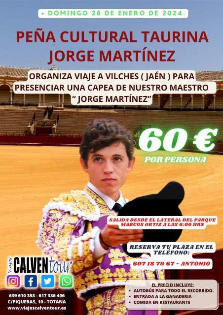 CALASPARRA. Jueves 18 de Enero de 2024. – NdP – La Asociación Taurina “El Quite de Calasparra” ha organizado un viaje muy taurino para un fin de semana bastante completo por la Comunidad de Madrid, para presenciar una interesante corrida de toros en la Feria del Aficionado de San Agustín del Guadalíx (Madrid), organizada por el Club Taurino 3 Puyazos, donde vienen organizando festejos taurinos buscando la importancia del toro y de todos los tercios de la lidia, especialmente la suerte de varas, y también visitaremos una ganadería.