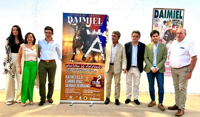 DAIMIEL (Ciudad Real). Viernes, 28 de julio de 2023. – NdP – Tauroemoción en colaboración con el Excelentísimo Ayuntamiento de Daimiel presentó este viernes en el patio del Museo Comarcal, junto al ganadero Victorino Martín y el matador de toros Sergio Serrano, el cartel de la próxima feria taurina en honor a la Virgen de las Cruces 2023. Completado por los matadores de toros Rafaelillo y Curro Díaz. En el acto también intervinieron el alcalde, Leopoldo Sierra, el presidente de la peña taurina de la localidad, José Julián Soto y el representante de Tauroemoción, Nacho de la Viuda.