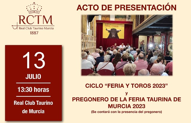 El pregonero ha presidido el acto de presentación del “Ciclo Feria y Toros 2023”, que se desarrollará del 6 al 17 de septiembre, con un amplio y variado programa del que destacan la entrega de la Medalla de Oro de la entidad a José Antonio Campuzano; un recuerdo al maestro Antonio Bienvenida en el centenario de su nacimiento; presentaciones de publicaciones escritas; una exposición de pintura y la entrega de los premios de la Feria Taurina de Murcia 2022.