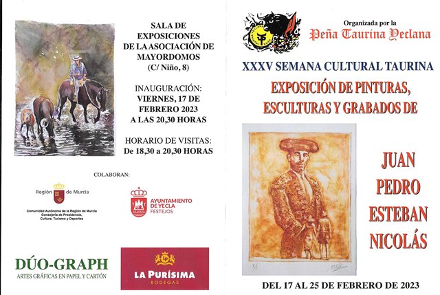 YECLA (Murcia). Domingo, 12/febrero/2023. – Prensa-P.T.YECLANA – La Peña Taurina Yeclana, con motivo de su “XXXV Semana Cultural”, invita a visionar la “Exposición de pinturas, esculturas y grabados”, de temática taurina, del artista cartagenero Juan Pedro Esteban Nicolás.