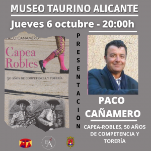 ALICANTE. Miercoles, 05/oct./2022. Informa: JOSE MARIA JERICÓ. Este jueves, 6 de octubre, a las 20,00 horas, el Salón de actos del Museo Taurino de Alicante, acogerá la presentación del libro escrito por el periodista salmantino, Paco Cañamero, «Capea – Robles, 50 años de competencia y torería.»