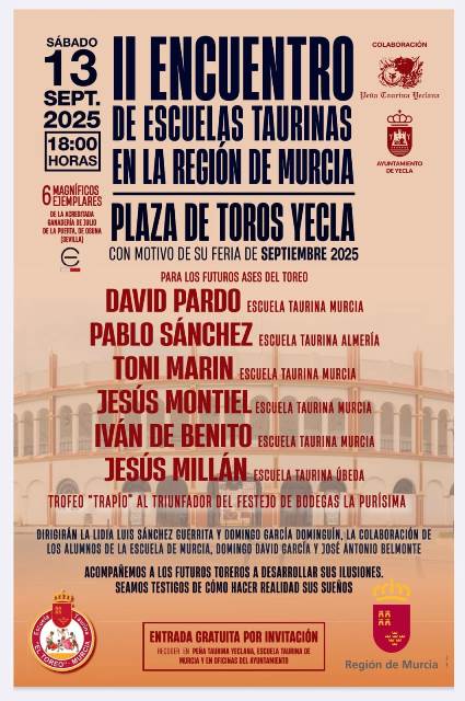 YECLA (Murcia). Miercoles, 03 de septiembre de 2025 – NdP – La Escuela Taurina de Murcia “El Toreo” ha programado con la colaboración de la Peña Taurina Yeclana y la Concejalía de Festejos del Ayuntamiento de Yecla una Sensacional Clase Practica, con la participación de cuatro de sus alumnos, a saber: