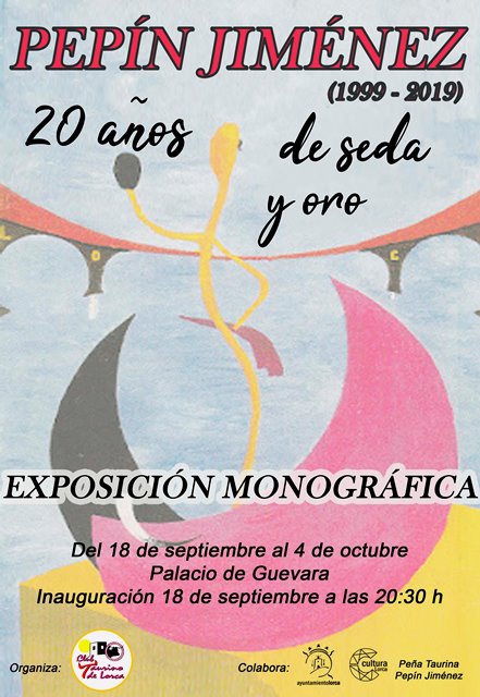 La exposición, que será inaugurada mañana miércoles, a las 20:30 horas, en el Palacio de Guevara de Lorca, lleva por título Pepín Jiménez (1999-2019): Veinte años de seda y oro, y estará expuesta entre el 18 de septiembre y el 4 de octubre, en horario de 10 a 14 h y de 17 a 19:30 h, pudiéndose visitar de forma totalmente gratuita.