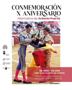 CEHEGIN (Murcia). Lunes, 11 de agosto de 2025. – Prensa-CTCEH – El próximo 14 de septiembre se cumplen diez años desde que, en la Plaza de Toros de Murcia, el maestro Julián López “El Juli” diera la alternativa a nuestro paisano el matador Antonio Puerta, siendo el testigo Miguel Angel Perera. El toro de la ceremonia se llamaba «Epicentro» y pertenecía nada más y nada menos que a la vacada de Victoriano del Rio. Antonio se entretuvo en cortar tres orejas esa tarde y proclamarse triunfador de la Feria Taurina de Murcia 2015, un triunfo ilusionante, cargado de ilusiones y esperanza.