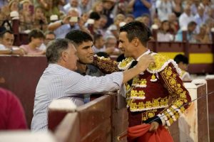 Nuestro Carlos Alcaraz durante el descanso formó un revuelo en el callejón, una multitud, la plaza entera, le tributó un auténtico baño de cariño, unánimes muestras de admiración, que recibió con agrado y su natural simpatía, correspondió atento y cercano con todo el mundo. José Maria Manzanares brindó su segundo toro a José Antonio Camacho y a Carlos Alcaraz, en medio de una atronadora ovación.