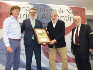 El primer lugar se entregó el galardón la Asociación Cultural Gastronómica y Taurina «De Tinto y Oro», de Valencia, en el 40 Aniversario de su fundación, por su gran labor de fomento y difusión de la Fiesta en Valencia. Hay estrechos lazos de amistad y colaboraciones entre la entidad valenciana y la alicantina. De manos Gabriel Bolufer, socio de la Tertulia «Amigos de Nimes», lo recibió Manuel Monzó -Presidente «De Tinto y Oro»-, acompañado del directivo Ximo Morales. El presidente de la entidad valenciana agradeció el galardón recibido de la Tertulia «Amigos de Nimes», e invitó a la concurrencia a visitar y conocer la sede de «De Tinto y Oro», ubicada muy cerca de la Plaza de Toros de Valencia.