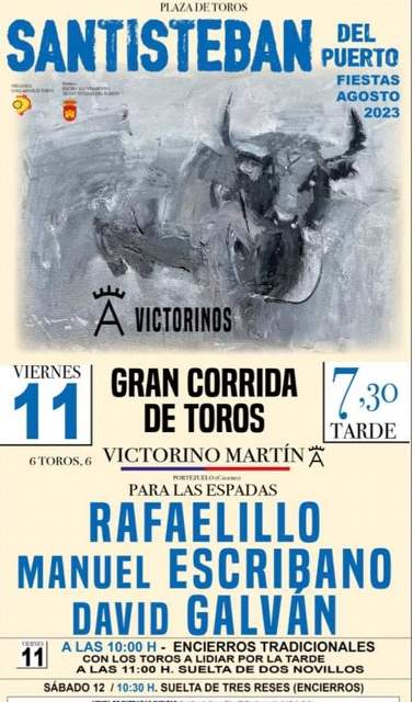 SANTISTEBAN DEL PUERTO (Jaén). Viernes, 11/agosto/2023. RESEÑA.- Feria de Pascuamayo, aplazada el pasado 27 de mayo por la lluvia. Toros de Victorino Martín para Rafaelillo, silencio y oreja. Manuel Escribano, oreja con fuerte petición y dos orejas. David Galván, oreja y oreja.