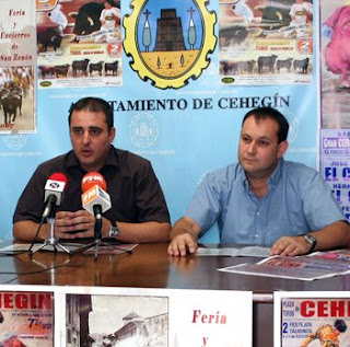 El concejal de Festejos del Ayuntamiento de Cehegín, Francisco Abril, y el presidente de la Asociación Pro-Encierros, Diego Martínez, presentarán la Feria de San Zenón, que se desarrollará los días 1, 2 y 3 de agosto, y contará con encierros, concursos de recortadores y dos corridas de toros.