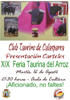El próximo Martes 12 de Agosto en el Aula de Cultura de Calasparra se presentarán los carteles de la XIX Feria Taurina del Arroz. El acto contará con la coordinación del Club Taurino de Calasparra.