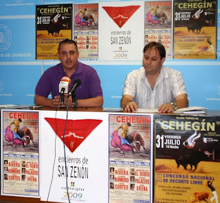 El concejal de Festejos de Cehegín, Francisco Abril, y el presidente de la Asociación Pro-Encierros, Diego Martínez, han presentado la programación de la Feria de San Zenón 2009, que traerá los días 30 y 31 de julio, y 1 y 2 de agosto, dos corridas de toros, encierros por las calles y concurso de recortadores y forcados, entre otras actividades.