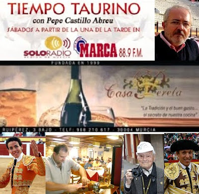 Capilla. Saluda el Director de “Tiempo Taurino” a toda la audiencia, con sus deseos de “paz y bien”. Comenta Pepe que aunque el programa está en antena hoy sábado, por causas obligadas, la cual no es otra que el Acto, dentro de los tradicionales Aperitivos Taurinos del Club Taurino de Murcia, de presentación del Circulo de Amigos de la Dinastía Bienvenida, en el cual se entregará la insignia de plata de este Círculo al propio Pepe Castillo y al doctor Don Andrés Salas y tendrá lugar la presentación del libro de Don Fernando Claramunt “Ecos del toricuarto”….Ver en enlace: WWW.NOTASDELAFIESTA.BLOGSPOT.COM
