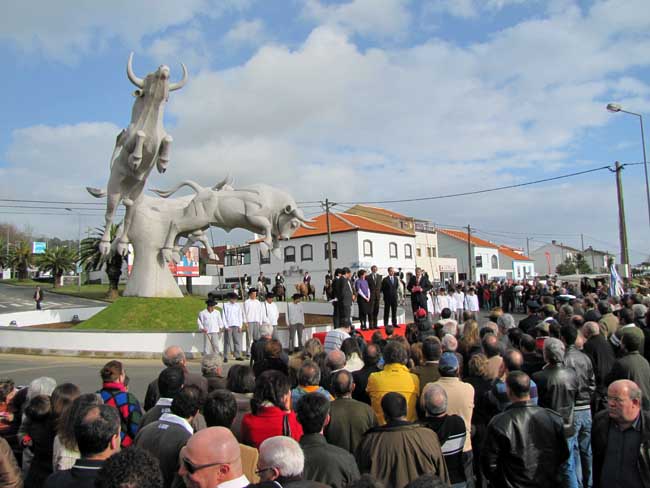 El pasado sábado 22 de enero se inauguró en Angra de Heroísmo, capital de la azoreña y portuguesa Isla Terceira, el monumento de mayores dimensiones dedicado al toro bravo de cuantos existen en el mundo. Obra del artista local Renato Costa e Silva, el grupo escultórico que forman sus tres astados se eleva hasta los once metros de altura desde la base y se ha instalado en una glorieta frente a la plaza de toros de la ciudad. De los 220.000 euros de costes e instalación del monumento, que mezcla en su estructura hierro, cemento, fibra de vidrio, ceniza volcánica y bronce, 150.000 euros han sido financiados por el gobierno autónomo de las Islas Azores y el resto por una larga nómina de particulares y empresas.
