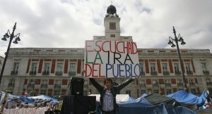 Un 'indignado' muestra una pancarta durante la acampada del Movimiento 15M en la Puerta del Sol. :: VÁCTOR LERENA / EFE
