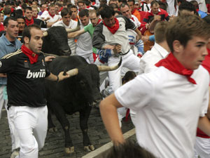 PAMPLONA. Sábado, 9 Julio 2011. Esta mañana, como cada mañana de Sanfermines, tras el madrugador chupinazo se abrian las Puertas de los Corrales del Gas de Pamplona. En esta ocasión,otra Ganadería de las»duras», hierros que no entran en «ferias comodas» -encastes que rehusan muchas figuras del momento-. El encierro ha sido rápido y limpio. Dos heridos, uno por asta de toro, es el balance provisional.