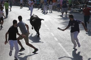 CALASPARRA (Murcia). Jueves, 6 Septiembre 2012. Informa.- Pepe Castillo Abreu. Foto.- Enrique Soler. Un día más con las calles muy concurridas. A las 10 en punto de la mañana, tras el chupinazo de rigor han salido de los corrales los veraguasde Prieto de la Cal que serán lidiados esta tarde en la Plaza de Toros de La Caverina. Novillada seria, muy bonita y bien rematada con pelajes variados: tres negros,dos jabonerosy un berrendo.Cuatro novilloshan tomado la cabeza con velocidad y casi en solitario durante la primera parte del trayecto, los otros dos loshan seguido a cierta distancia peromanteniendo el buen ritmo de sus hermanos.A la mitad del trayecto se han dejado ver losmozos que en número creciente han acompañado los novillos hasta la plaza de toros.Los cuatro novillos adelantados muy agrupados, curiosamente, han esperado a los dos rezagadosen la mismapuerta del patio de caballos, entrando directamente los seis a los corrales.El recorrido ha sido limpio y sinnada de importancia que resaltar, tan solo en la curva de la Casa de Cultura un novillo haarrollado a un joven, la voltereta ha sido fuerte,siendo atendido por el Equipo Médico, que tras tenerlo en observación no se le han apreciado lesiones. El tiempo empleado hoy ha sido de 2’26» en llegar a la plaza y de 3′ y 52″ en entrar a los corrales.