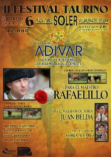 MURCIA. Domingo, 24 Marzo 2013. Informa.- Pepe Castillo Abreu. Ayer sábado se presentó en Villanueva del Rio Segura el cartel del II Festival a Beneficio de Adivar -Asociación de Personas con Discapacidad Valle de Ricote-, que se celebrará en esta localidad murciana el 6 de abril (sábado), en horario matinal, las 12 horas, en la Plaza de Toros Antonio Soler. Rafaelillo lidiará dos toros de Juan Antº. Ruíz «Espartaco», en tanto, el matador de toros de Fortuna, Juan Belda y el novillero alicantino Borja Álvarez se enfrentarán a dos novillos-toros de Juan Ruíz Palomares.