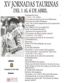 Del Lunes 1 a Sábado 6 de Abril, la Peña Taurina «Pepín Líria» de Vélez Rubio organiza sus XV Jornadas Taurinas: Conferencias, Exposición «Los Toros y El Flamenco», de José Antonio Franco y el II Concurso de Dibujo Taurino Infantil completan el programa.