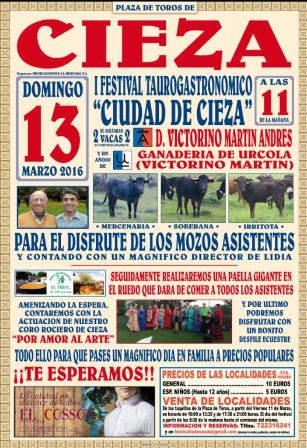 Primer Festival «Taurogastronomico Ciudad de Cieza». Plaza de Toros «La Deseada». Domingo, 13 Marzo, a partir de las 11 horas.