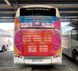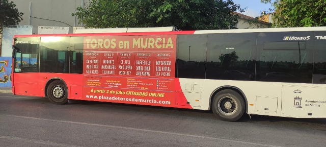 MURCIA. Sabado, 08/julio/2023. -NdP – La empresa Toros Sureste está realizando un importante desplieque publicitario para anunciar la feria taurina de septiembre. Autobuses de línea que recorren la ciudad y los alrededores, incluyendo las zonas costeras más importantes, y un buen número de vallas publicitarias y monopostes estrategicamente colocados logran crear un ambiente taurino en la ciudad cuando ya se ha activado la venta de entradas online.