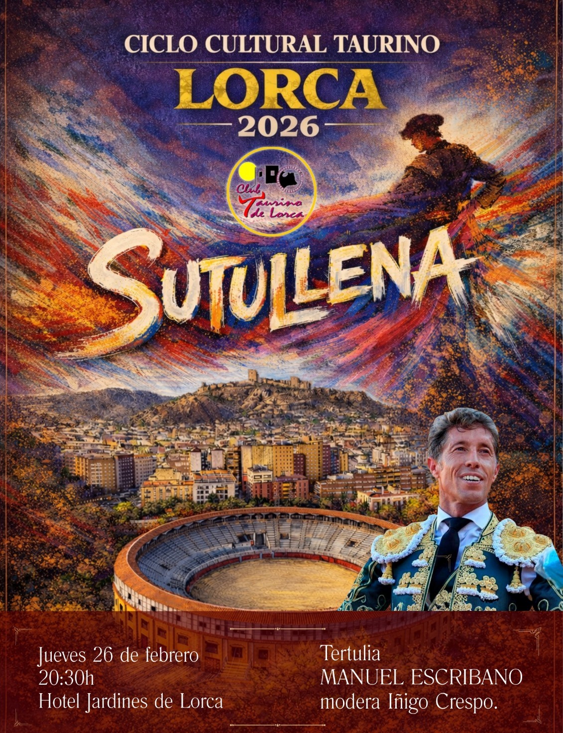 Como adelanto a esta presentación oficial, el Ciclo Cultural Taurino de Lorca 2026 arrancará con una primera cita de gran interés para los aficionados. El jueves 26 de febrero, a las 20:30 horas, el Hotel Jardines de Lorca acogerá una tertulia taurina con el diestro Manuel Escribano, que estará moderada por el periodista Íñigo Crespo.