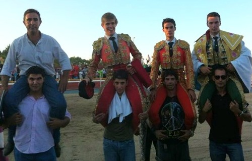 NAVALCÁN (Toledo). Jueves, 16 Agosto 2012.- Fuente.- Acotauro. Antonio Puerta corta cuatro orejas y un rabo y sale a hombros junto a Raúl Rivera y Javier Jiménez, en la novillada celebrada esta tarde en la localidad toledana de Navalcán. El ceheginero desoreja al primero de su lote y corta los máximos trofeos de su segundo, al que se llegó a pedir el indulto. La novillada lucía el hierro de ‘Guadajira’.