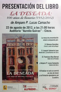 CIEZA (Murcia). Viernes, 17 Agosto 2012. Texto.- Pepe Castillo Abreu. El Auditorio Aurelio Guirao de Ciezaacogerála presentación deesta últimaobra de la profesora y escritora local Amparo P. Lucas, al que laautora leha dedicadodos intensosaños de trabajo, enriquecidos con cariño ytoda la ilusión que ha significado para ellahonrar, desde la literatura y sus sentimientos, la dilatadae importantehistoriataurina de la emblemática Plaza de Toros de Cieza. El libro lleva por titulo »La Deseada, 100 Años de Historia», y es una idea madurada desde hace años,eligiendo viera la luzel año 2012,a modo depersonal homenajede conmemorar esta efeméride. Se recogen losacontecimientos, anécdotas, vivencias… que forjansus 100 años de historia. Destacando los innumeralbles triunfos de Dámaso González, con indulto incluidode un toro de Samuel Flores.