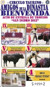 MADRID. Mañana, Jueves 4 de Octubre de 2012, a las 15,00 horas, el Hotel Rafael Ventas -Calle Alcalá, 269- acogerá elActo de Entrega de los Trofeos correspondientes a la Feria de “San Isidro” 2012 y otros honoríficos.