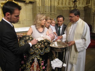 Y la Virgen de la Fuensanta, no solo cubrió el cerrado cielo con su manto; también, en el momento del bautismo un precioso capote de paseo de Rafaelillo, con la imagen de la Fuensanta cubrió a Valeria. Entre los invitados, natural, muy notoria fue la presencia de ”˜”™gente del toro”™”™. No sorprendió la presencia de un gran matador de toros, Antonio Ferrera, gran compañero y mejor amigo de Rafaelillo, que aunque intentó mantenerse en un discreto segundo plano, no lo consiguió. Fuimos muchos los que nos alegramos de poder saludar al extremeño, con el respeto y admiración que se merece. También, (salvo alguna excepción por justificado motivo) de la cuadrilla de Rafaelillo estuvieron José Mora, Pascual Mellinas, Esquivel y Antonio Muñoz. Abraham Neyro, que fuera banderillero del murciano, también se desplazó a Murcia….