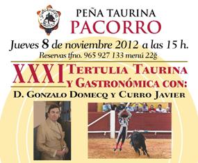 ALICANTE. Sábado, 27 Octubre 2012. Informa.- José María Jericó. El premio a la ”˜Mejor Ganadería”™ de este año, lo recogerá el ganadero D. Gonzalo Domecq, propietario del hierro de “Martelilla” por el extraordinario juego dado por la novillada lidiada el pasado 23 de junio, y el premio al ”˜Mejor Subalterno”™ lo recogerá el torero de plata, Curro Javier, al haber sido distinguido por este grupo de aficionados, por su completa actuación la tarde del 20 de junio, tanto en banderillas como en la brega con el capote, toreando a las órdenes de José María Manzanares.