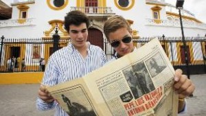 Gonzálo Bienvenida y Pepe Luis Vázquez leen un reportaje sobre sus abuelos en las puertas de la Maestranza
