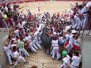 El encierro de hoy, que durado 4′ 15», ha sido mucho más peligroso que el de ayer con muchas caídas en el recorrido, siendo la peor consecuencia el gigantesco tapón humano que se ha producido en el acceso al ruedo de la Plaza de Toros.