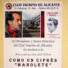 ALICANTE. Jueves, 21 Noviembre 2013. Informa.- José María Jericó. El matador de toros Luis Francisco Esplá, Medalla de Oro al Mérito en las Bellas Artes, presentará en el Club Taurino de Alicante, este viernes, 22 de noviembre, a las 20,00 horas, el libro “Como un ciprés. Manolete”, escrito por Pedro Ballester Lorca.