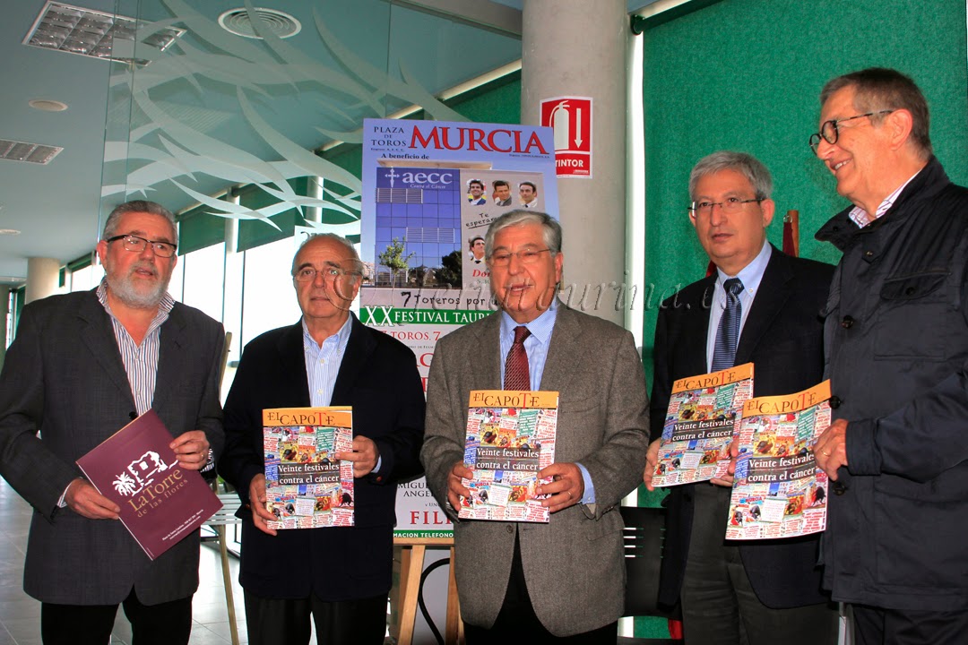 www.feriataurina.es. La sede de la Asociación Provincial de la Lucha contra el Cáncer de Murcia acogió ayer la presentación de la revista. El Capote que ha sido dedicada a este festejo taurino que se celebrará el próximo domingo en el coso de la Condomina y de la que han sido editados 10.000 ejemplares. El editor y director de la publicación, el periodista Mariano Caballero, ha señalado que los ejemplares serán distribuidos estos días por hoteles, restaurantes y juntas locales de la Asociación, entre otros lugares, mientras que el domingo se hará lo mismo en la plaza de toros de Murcia. Caballero ha añadido que El Capote llega a su cuarta edición y que con esta revista lo que se pretende es contribuir a la difusión del festival benéfico y, así, fomentar la afluencia de aficionados al coso taurino.
