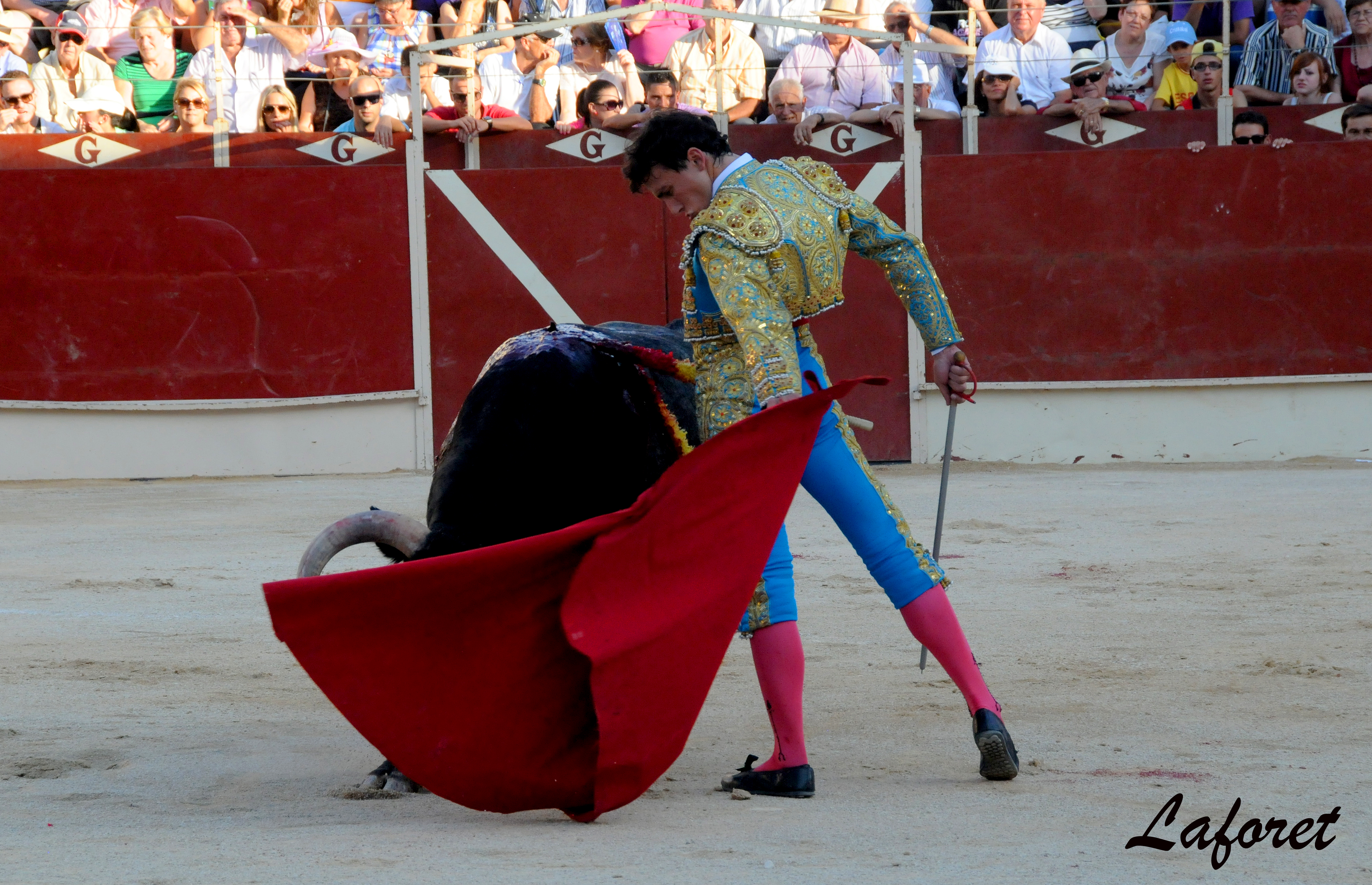 muleta, y supo tapar los defectos a los »nazarios» a base de no dejarlos pensar, llevarlos embebidos en la muleta, enganchándolos muy delante y vaciando larga la embestida, para ejecutar un toreo en redondo en series cortas pero intensas que calaron. Con la espada, en general, estuvo hecho un cañon, salvo en el cuarto y último al que pincho