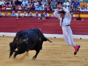 su 1º, le costó recogerlo en el recibo. Puyazo de trámite, tras probarlo pidió el cambio. Un toro noble, justo de fuerza. y que un volteretón en el trasteo inicial de muleta acabo por quebrantarlo. Acabo rajándose. Media estocada trasera y tendida. Ovación con saludos. En el quinto, llegó lo mejor con gran diferencia de la corrida. Lances muy aplaudidos de recibo. El toro galopó alegre y ya se le observó una excelente clase, bravo, repetidor y con un gran fondo. Curiosidad, por la mañana en los corrales, este »Filosófo», se había hecho el amo, manteniendo a raya sus hermanos, dejando claro quién era el líder, marcó sus dominios, y miraba altanero a los que se asomaban por las troneras. Volviendo a la faena, en el encuentro con el caballo metió el pitón en el peto, metiendo los riñones y romaneando con fuerza varias veces hasta que se desenganchó. Se aplaudió al picador que solventó los apuros. Trasteó Ponce de inicio con suavidad sabiendo ya la excelencia del toro, y en las dos primeras tandas la plaza rugió. La faena, de principio a fin, fue impecable en técnica, en elegancia y estética, en la verticalidad y exquisito gusto del toreo en redondo por ambos pitones, saliendo de cada serie con cambios de una cadencia y lentitud de gran