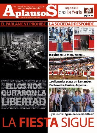 Esta semana la revista Aplausos le dedica especial atención a lo ocurrido la pasada semana en el Parlament de Catalunya y a todas las reacciones que ha generado la prohibición de las corridas de toros en esta comunidad autónoma.