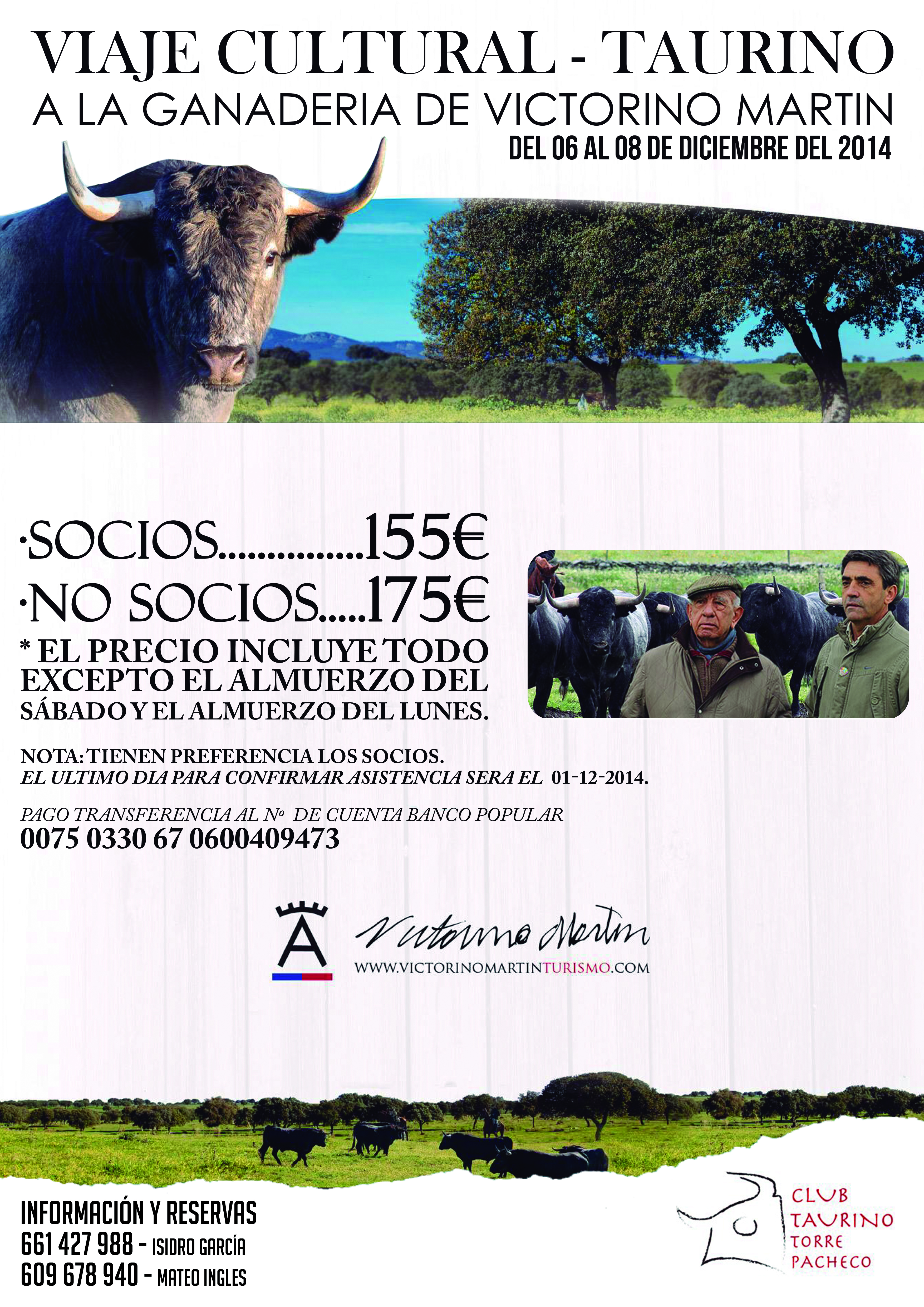 TORRE PACHECO (Murcia). Nos informa el joven Club Taurino de Torre Pacheco, que preside Isidro García, de su nuevo viaje Cultural-Taurino, y desde luego no puede tener mejor »Titulo» por su atractivo y completo programa. El Puente de la Inmaculada es fecha más que propicia, ya a punto de entrar el invierno, para hacer estos viajes tan extraordinarios y de especial excelente acogida entre los buenos aficionados y los menos buenos. Que, desde luego, son viajes de gran importancia para acercar la grandeza y la inmensa belleza de Los Toros, a través del Campo Bravo, especialmente para aquellos que nunca lo han visitado. Y al tiempo, como es el caso de este bonito viaje, como de otros, para hacer turismo cultural por una zona de España tan bonita y tan taurina como es Cáceres y su entorno. Incluido, obviamente, la Finca »Las Tiesas», propiedad de D. Victorino Martín, en Coría (Cáceres).