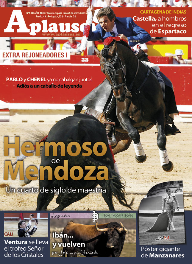 Asimismo, el semanario dedica un reportaje al caballo Chenel, de Hermoso de Mendoza, que falleció hace escasos días así como también informa de todo lo acontecido en las principales plazas de América como México, Cali o Cartagena de Indias. Además, y como viene siendo habitual, se cuenta con las firmas de opinión de José Luis Benlloch, Manolo Molés, Carlos Ruiz Villasuso y Paco Mora. Para más información pueden visitar la web www.aplausos.es. El ejemplar ya está disponible en iPad y Doopaper.