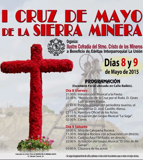 La Ilustre Cofradía del Stmo. Cristo de los Mineros ha organizado, en colaboración con el Ayuntamiento de La Unión, la celebración de la I Cruz de Mayo de la Sierra Minera, a Beneficio de Cáritas Interparroquial, Este viernes 8 y sábado 9 de Mayo.
