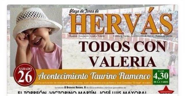 de fuentes fidedignas, por descontado no me he molestado en contrastar nada al respecto con la otra parte, o sea, el Ayto, de Hervás (Cáceres). Para qué perder el tiempo…Como se sabía, el pasado sábadose anunciaba un festival taurino con fines benéficos, en el que habrían actuado los matadores de toros Luis Vilches, Guerrita Chico, Emilio de Justo, Alejandro Esplá, Pedrito de Mérida,los novillerosCristina Hernández, Javier de Pradoy el becerrista Ismael Jiménez.Que habrían lidiado reses deEl Torreón, Victorino Martín, José Luis Mayoral, Hrdos. de Hermanos Asensio, Matías Carretero, El Madroñal y Los Bayones,y cuyos beneficios estaban destinados para ayudar en la difícil situación que atraviesa la familia de la niña Valería, a causa de su delicada enfermedad.
