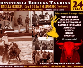 CONVIVENCIA ROCIERA TAURINA – FINCA LA HERENCIA. EL JIMENADO (Torre Pacheco). Domingo 24 de Abril, desde las 12 de la mañana.
