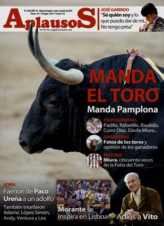 “Manda el toro, manda Pamplona”. Así abre esta semana la Revista APLAUSOS con un completo especial de 22 páginas sobre la Feria del Toro de la capital navarra. A lo largo del extra hablan algunos de los protagonistas del abono como Juan José Padilla, Juan Bautista, Rafaelillo, Curro Díaz o Javier Jiménez. Además, los ganaderos de la feria analizan las corridas que lidiarán y cuyos toros aparecen fotografiados en el campo.