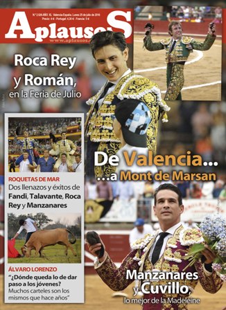 El número 2.026 de APLAUSOS ya está en los quioscos. En primera página, el semanario taurino destaca la actualidad de la Feria de Julio de Valencia, donde sobresalieron Roca Rey y Román; la Feria de la Madeleine de Mont de Marsan, donde Manzanares y Núñez del Cuvillo firmaron lo mejor del abono; y el ciclo de Santa Ana de Roquetas de Mar, con dos llenos y los éxitos de El Fandi, Talavante, Roca Rey y Manzanares.