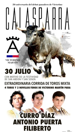 -Sábado 30 de Julio -Día de Los Santos-, a las 11:45 horas. Se descubrirá azulejo conmemorativo del 50 aniversario del debut como ganadero de D. Victorino Martín Andrés, en el patio de cuadrillas de la plaza de toros de Calasparra.