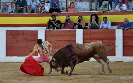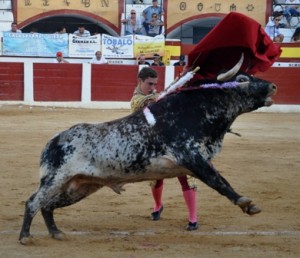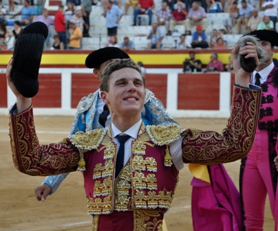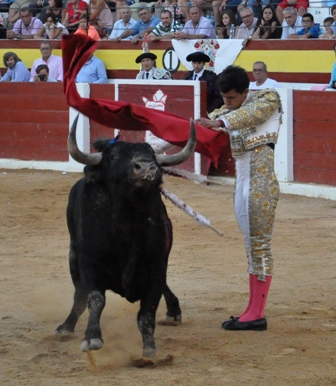 hasta con alguna posible malformación se le observó en los cuartos traseros,posiblemente fuera lo que le hacía ir renqueante y dando unas arrancadas descoordinadas. Fue muy molesto en la muleta, iba rebrincado dando tornillazos y soltando la cara. Anduvo firme el francés y los muletazos fueron meritorios por las dificultades. La estocada algo delantera y perpendicular fue efectiva. Paseo una oreja que se pidió con fuerza.En el que cerró plaza salió con ambición, lo recibió con larga cambiada y ajustadas verónicas.El innecesario segundo puyazo dejó el novillo muy parado, ahí se equivocó porque la faena de muleta careció de interés, mostró buenas maneras. De haber acertado con la espada quizá le habrían pedido trofeo. Se pasó de tiempo y escuchó un aviso y el ambiente bajó de tono. Silencio.