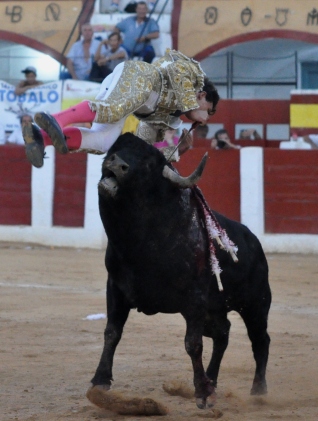 de efecto fulminante. Rodó sin puntilla, pitos en el arrastre, y ovación con saludos.En el 5º, otro auténtico toro, salió algo suelto, pero logró sujetarlo a base de disposición, y el recibo fue el más vibrante y de mayor lucimiento de la tarde.Se cambió tras un puyazo. Comprometido fue el tercio de banderillas resultando lesionado el banderilleroManuel Macíasque tuvo que tomar el olivo y cayó de fea manera al callejón.La faena de muleta mantuvo la emoción de principio a fin, porque la disposición y los riesgos que afrontó Juan de Castilla fueron máximos.Se mantuvo firme, consintió y acabó sometiendo al complicado y peligroso de nombre Janoto, al que le pudo sacar lo mejor toreando al natural, cerró adornándose con manoletinas.El colombiano se calentó y busco la puerta grande tirando la moneda al aire, y en la suerte suprema sorprendió y conmovió a todos cuando al perfilarse con la espada se deshizo de la muleta,se tiró como una exhalación a la yema resultando prendido y lanzado al aire con mucha violencia, se temió una fuerte cornada, todo quedó en la paliza y en el susto. Lástima porque entregarse de esa manera merecia el doble premio, que de haber acertado a la primera se le habrían pedido con fuerza. Paseo una merecida oreja. Desde luego un premio al valor y a la entrega de Juan de Castilla sería incuestionable.