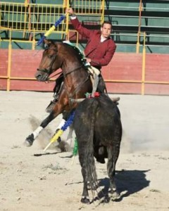afianzándose como un rejoneador con gran proyección y sus actuaciones se siguen contando por triunfos, siendo su toreo a caballo realmente espectacular conectando con el público. La tarde de hoy su actuación ha sido muy completa y ha probado un nuevo caballo, castaño de capa, al que ha »bautizado» con el nombre de «Pepe Castillo». Me dicen en su entorno que el nombre de este nuevo equino en su cuadra lo han decidido poner como homenaje a quién escribe este texto, de información remitida, y que hoy mi homónimo ha tenido un debut realmente espectacular en banderillas, tercio en el que también han participado eficazmente «Zorro» y «Vargas». Antes de salida se lucio parando con«Zarito». Y en el último tercio «Domingo» ha estado sensacional. La parada del novillo, banderillas al quiebro y las piruetas en la cara del novillo han sido espectaculares y de máximo riesgo. Certero con el rejón de muerte.