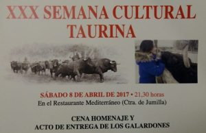 YECLA (Murcia). Miércoles, 5 Abril 2017. REDACCIÓN.- En el Restaurante Mediterráneo, ctra. de Jumilla, la Peña Taurina Yeclana, que preside Francisco Navarro, celebrará el próximo sábado, 8 de abril, a partir de las 21:30 horas, su tradicional Cena Homenaje y Acto de Entrega de los Galardones de la temporada 2016, enmarcada dentro de la XXX Semana Cultural Taurina que viene celebrando. Organiza Peña Taurina Yeclana, con la colaboración del Excmo. Ayto. de Yecla y Bodegas La Purísima.
